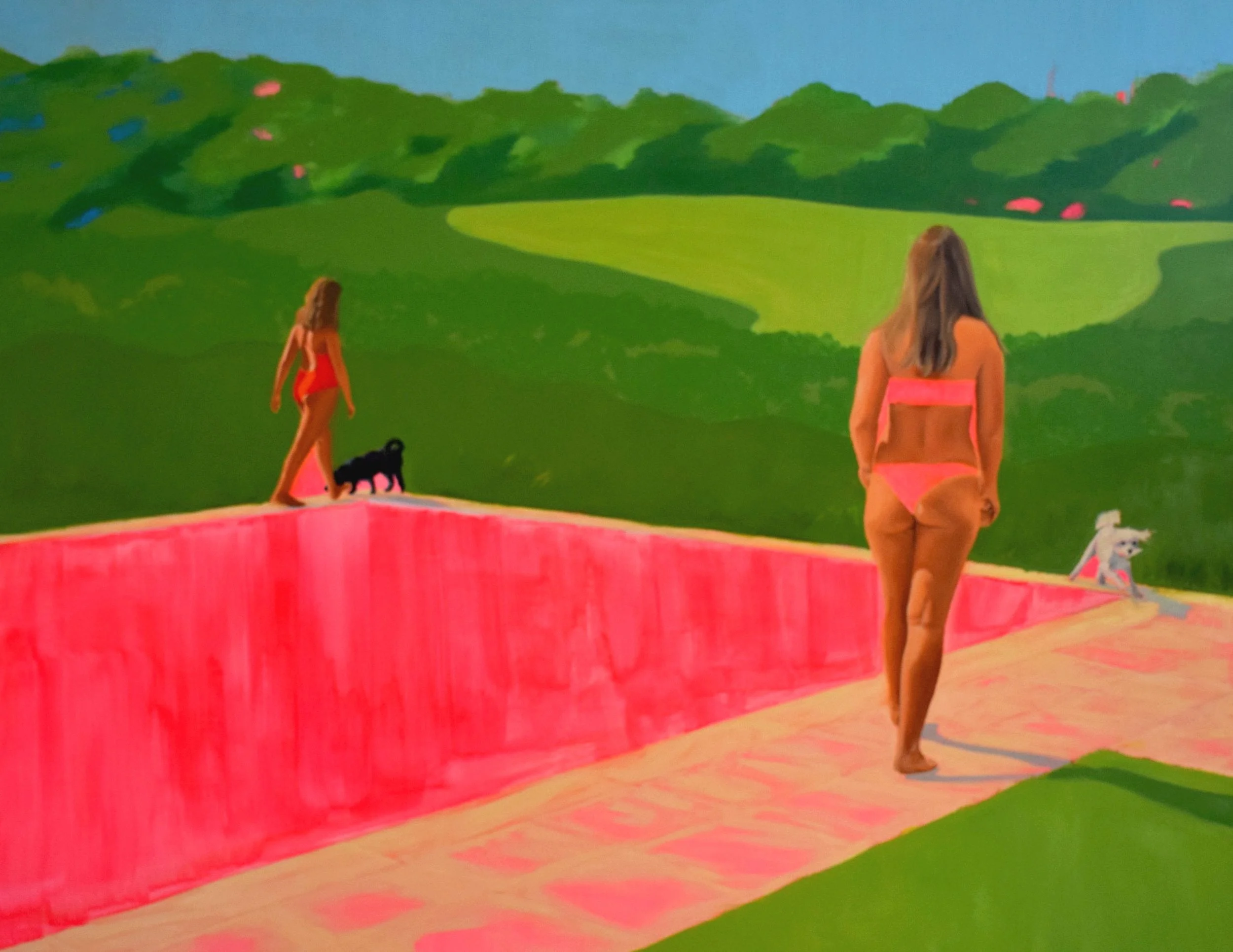 In this work, the pink of the pool contrasts with the natural greens, creating a surreal landscape that feels both familiar and otherworldly. This contrast symbolizes friendship enduring through all phases of life, just as the vibrant tones endure in the peaceful surroundings.